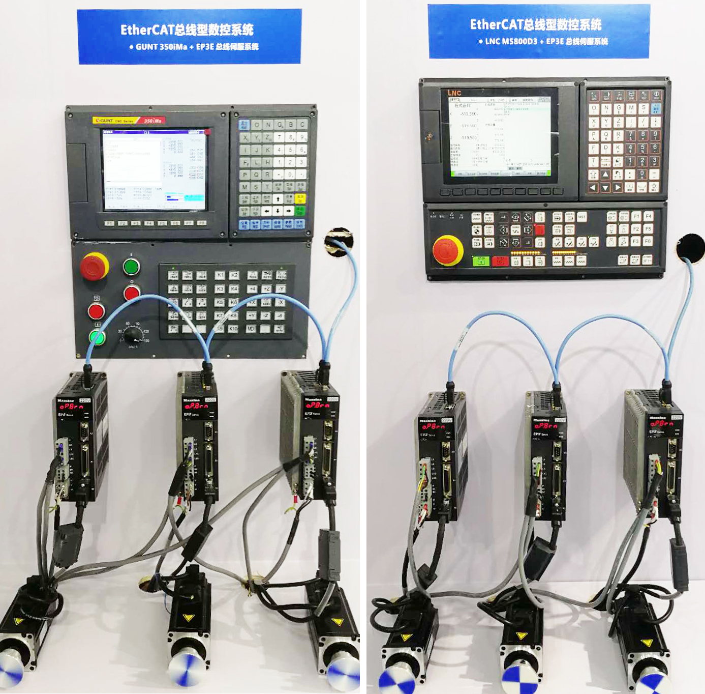 ▲ EtherCAT總線型數(shù)控系統(tǒng)(左圖:GUNT 350iMa + EP3E總線伺服系統(tǒng),右圖:LNC M5800D3 + EP3E總線伺服系統(tǒng))