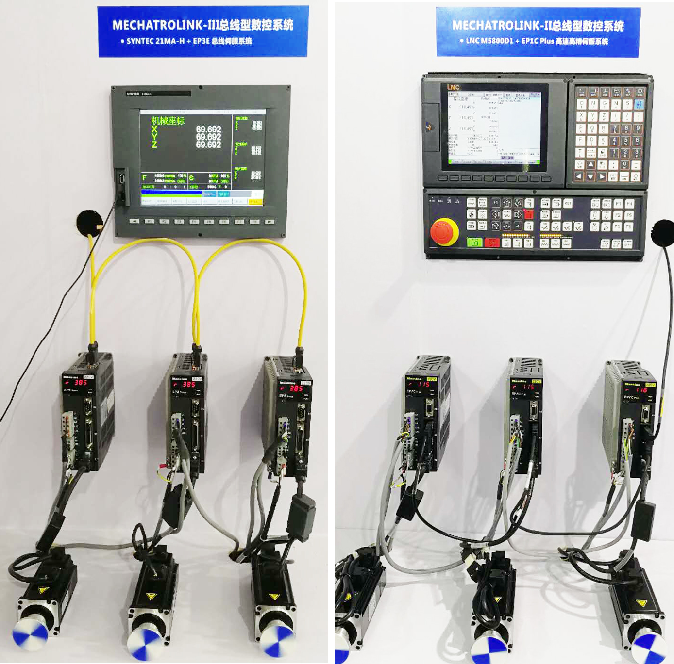 ▲ 左圖:MECHATROLINK-Ⅲ總線型數(shù)控系統(tǒng)(SYNTEC 21MA-H + EP3E總線伺服系統(tǒng)),右圖:MECHATROLINK-Ⅱ總線型數(shù)控系統(tǒng)(LNC M5800D1 + EP1C Plus高速高精伺服系統(tǒng))