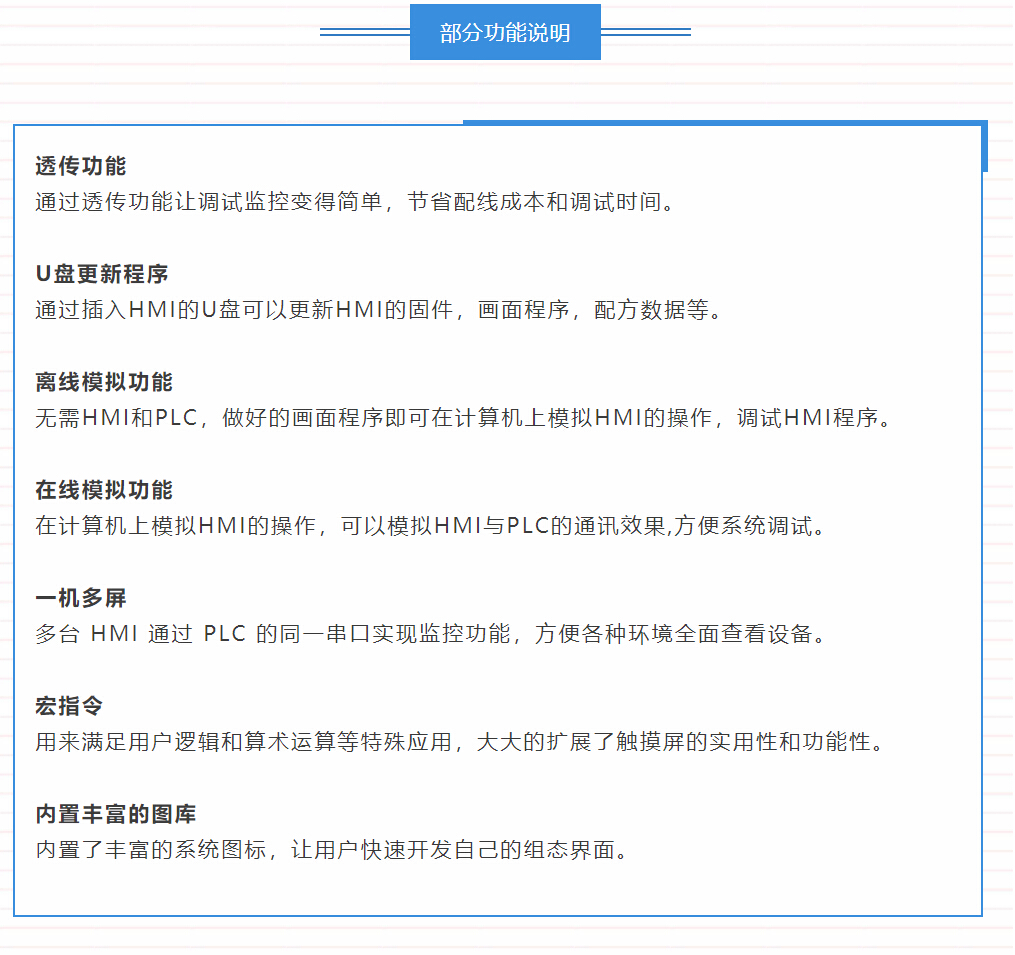 配方通俗的講就是一組數(shù)據(jù)的集合,是指保存在 HMI 內(nèi)部一組連續(xù)的寄存器中的數(shù)據(jù),該區(qū)域中的數(shù)據(jù)是可掉電保存的。使用時,通過選擇不同的配方索引組別,可將該組數(shù)據(jù)快速下載到控制器中使用,比如:你的生產(chǎn)線需要生產(chǎn)100 種商品,那么輸入這些商品的參數(shù)將是一個很耗時的工作。加入這些數(shù)據(jù)被事先輸入到配方中,那么當(dāng)你更換需要生產(chǎn)的產(chǎn)品種類時,只需要更改配方號即可,而無需去實時的輸入數(shù)據(jù),這樣做的另外一個好處就是數(shù)據(jù)在現(xiàn)場對于操作人員來說是不可見的,從而保護了你的數(shù)據(jù)安全,讓生產(chǎn)變得更加簡單。