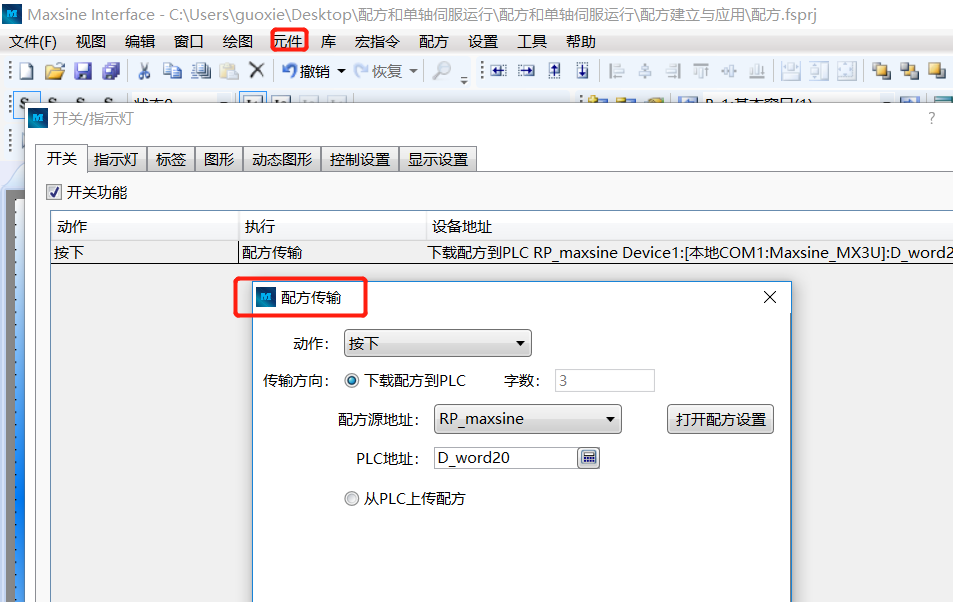 3.1 點擊“元件→開關(guān)→配方傳輸”出現(xiàn)下列窗口,設(shè)置配方源地址,下載至PLC起始地址D20,確認(rèn),完成配方下載功能按鈕。