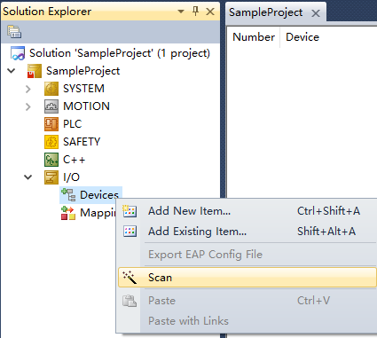 在配置模式下,點擊左側(cè)工程欄內(nèi)IO,右鍵Devices,點擊Scan,