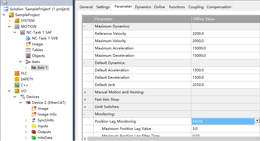 點擊左側(cè)工程欄中MOTION→Axes→Axis1,將Parameter窗口中的Monitoring下Position Lag Monitoring 改為false(關(guān)掉跟隨誤差監(jiān)視);