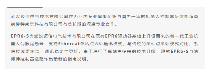 • 首頁>文章中心>應(yīng)用教程>EPR6-S機(jī)器人專用伺服與納博特控制器適配指南