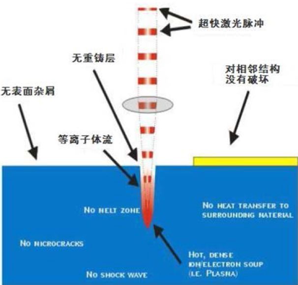 超短脈沖加工能量極快地注入很小的作用區(qū)域,瞬間高能量密度沉積使電子吸收和運(yùn)動(dòng)方式發(fā)生變化,避免了激光線性吸收、能量轉(zhuǎn)移和擴(kuò)散等影響,從根本上改變了激光與物質(zhì)相互作用機(jī)制。
