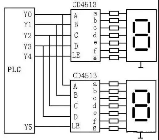 LE為高電平時,顯示的數(shù)不受數(shù)據(jù)輸入信號的影響。顯然,N個顯示器占用的輸出點(diǎn)數(shù)為P=4+N。如果PLC使用繼電器輸出模塊,應(yīng)在與CD4513相連的PLC各輸出端接一下拉電阻,以避免在輸出繼電器的觸點(diǎn)斷開時CD4513的輸入端懸空。PLC輸出繼電器的狀態(tài)變化時,其觸點(diǎn)可能抖動,因此應(yīng)先送數(shù)據(jù)輸出信號,待該信號穩(wěn)定后,再用LE信號的上升沿將數(shù)據(jù)鎖存進(jìn)CD4513。