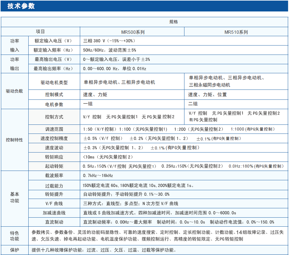 MR500系列是邁信電氣新一代的變頻器主力機(jī)型,高性能、高品質(zhì)、高功率密度設(shè)計(jì)。主要定位為中高端市場(chǎng)的OEM客戶及特定的風(fēng)機(jī)、水泵類負(fù)載應(yīng)用場(chǎng)合,其設(shè)計(jì)靈活,內(nèi)嵌SVC、VF控制與一身,可廣泛應(yīng)用于對(duì)速度控制精度、轉(zhuǎn)矩響應(yīng)速度、低頻輸出特性有較高要求的應(yīng)用場(chǎng)合。