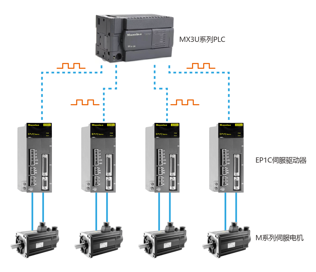1、邁信PLC+4臺(tái)EP1C伺服驅(qū)動(dòng)器+4臺(tái)邁信伺服電機(jī)